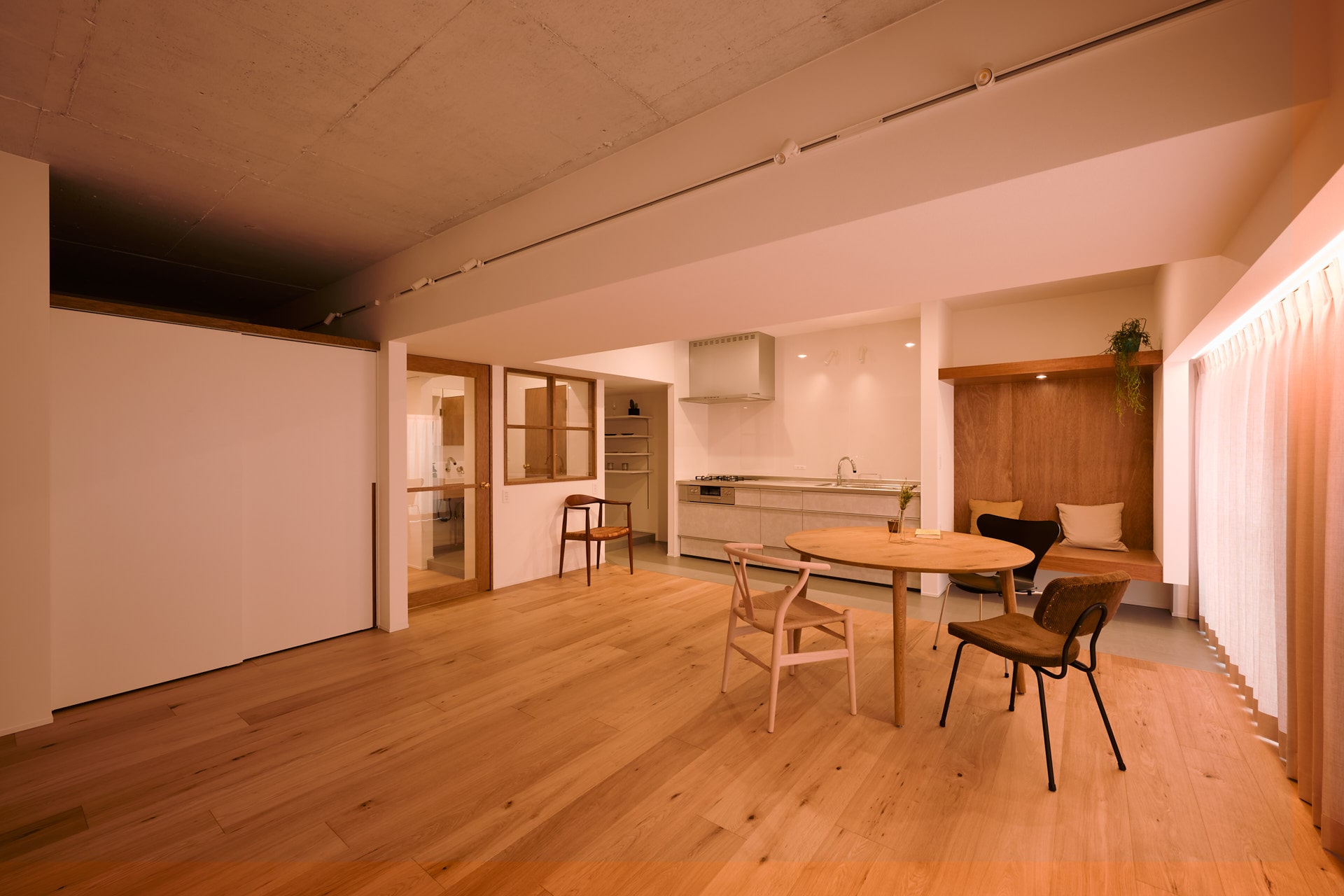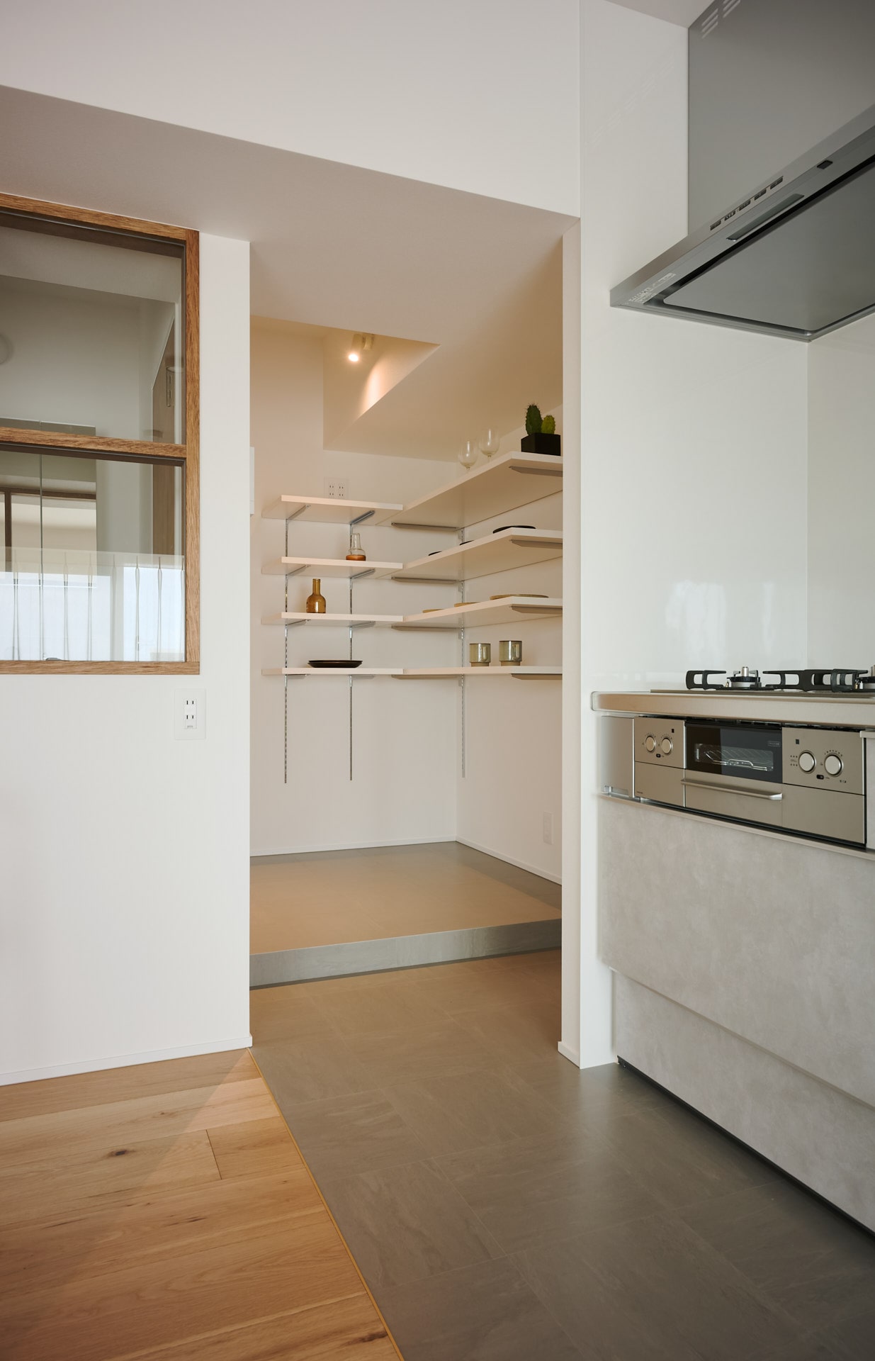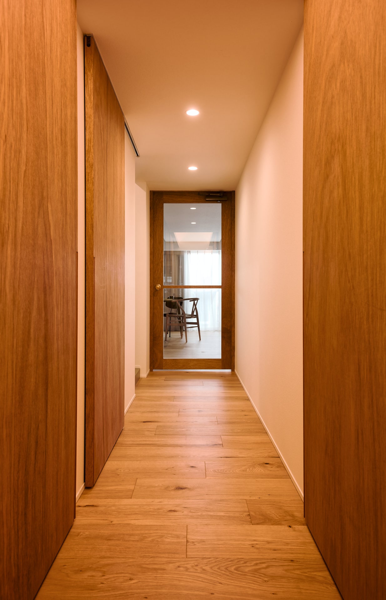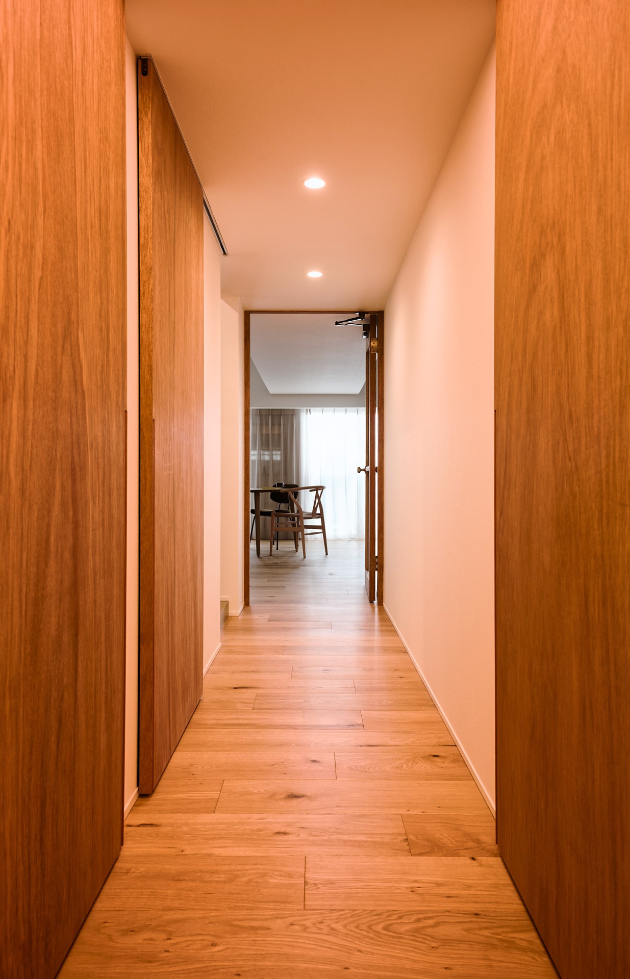 回遊性移動や多方向移動のため、浴室やトイレなどを除く全ての諸室を引戸で連続させているのでタイムパフォーマンスも非常に高い。スケルトンリノベーションの魅力は既存の間取りに制約を受けないという事に尽きるが、本計画においても個室は最小限とし、その他の余白をシューズクローゼットやウォークインクローゼット、また食品庫など、現代の生活に必須の機能へと置換え、自由設計のメリットを最大化させている。