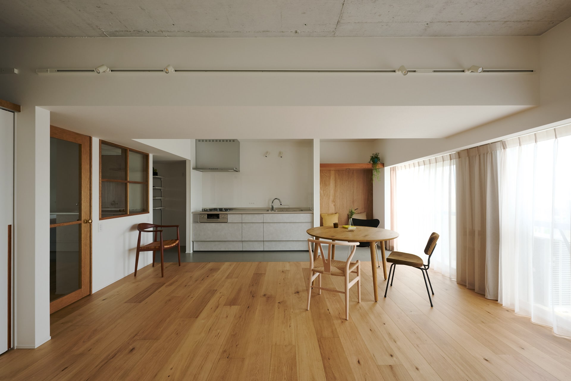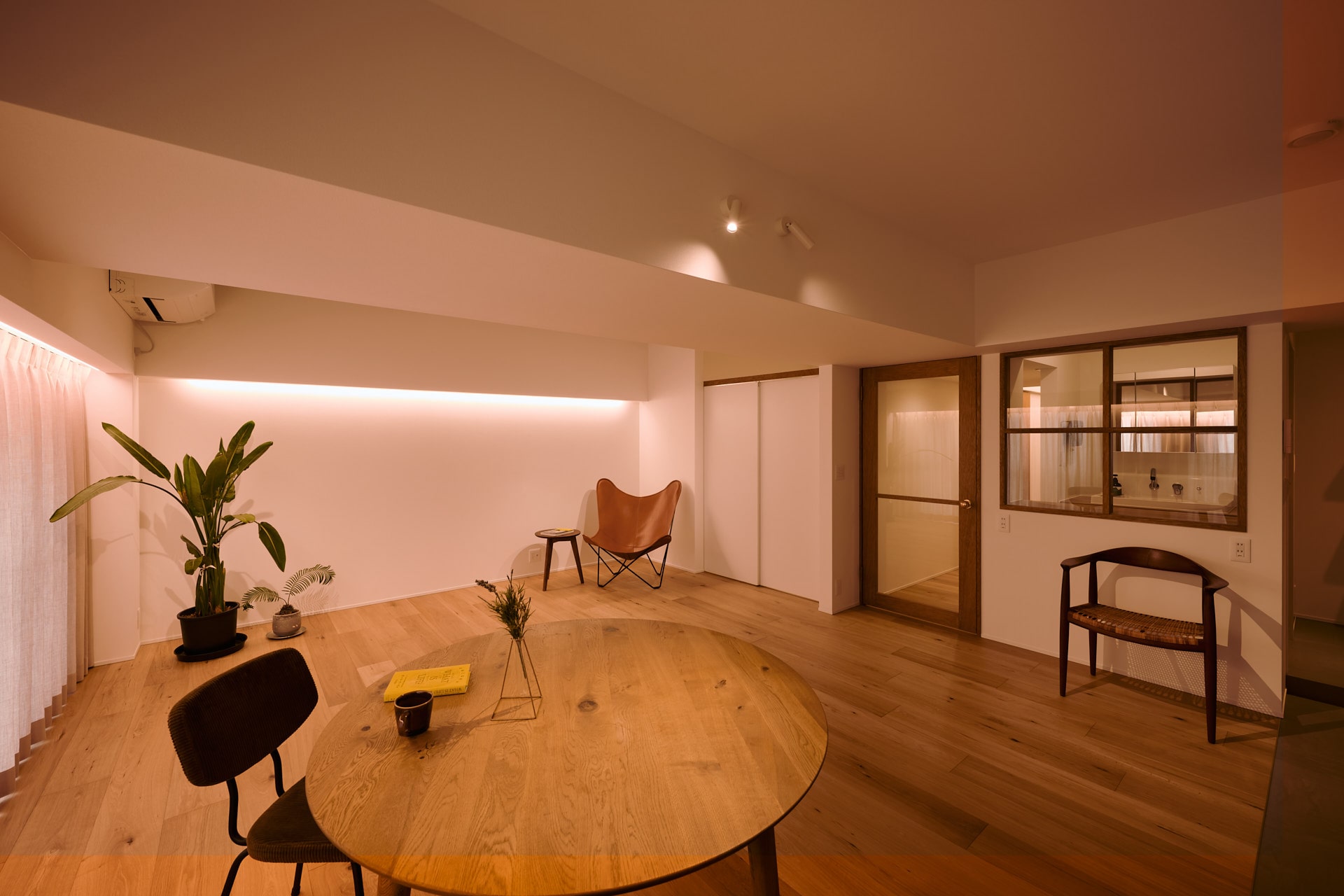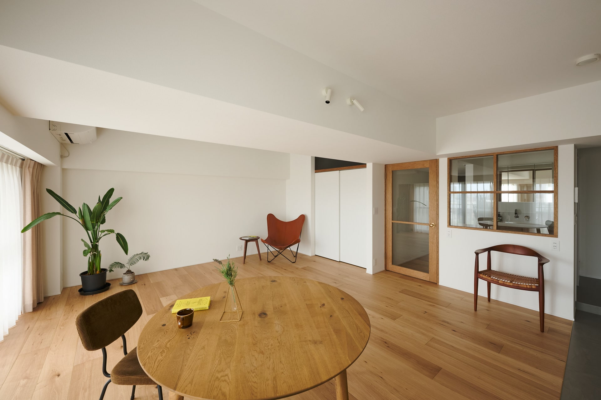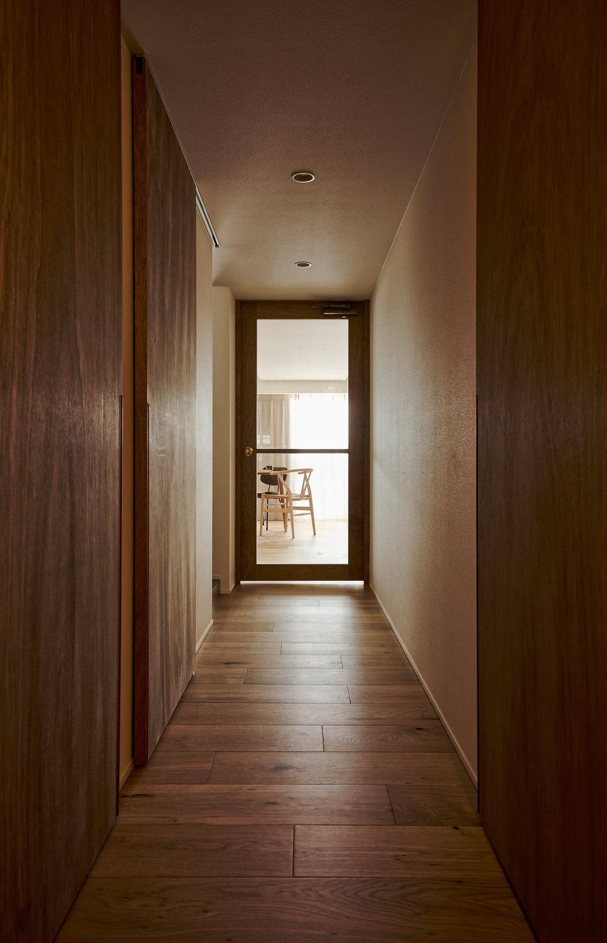 回遊性移動や多方向移動のため、浴室やトイレなどを除く全ての諸室を引戸で連続させているのでタイムパフォーマンスも非常に高い。スケルトンリノベーションの魅力は既存の間取りに制約を受けないという事に尽きるが、本計画においても個室は最小限とし、その他の余白をシューズクローゼットやウォークインクローゼット、また食品庫など、現代の生活に必須の機能へと置換え、自由設計のメリットを最大化させている。