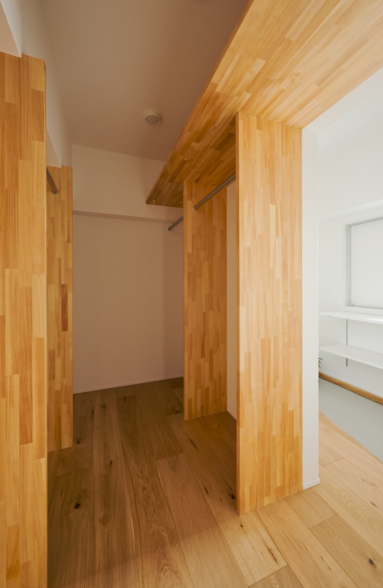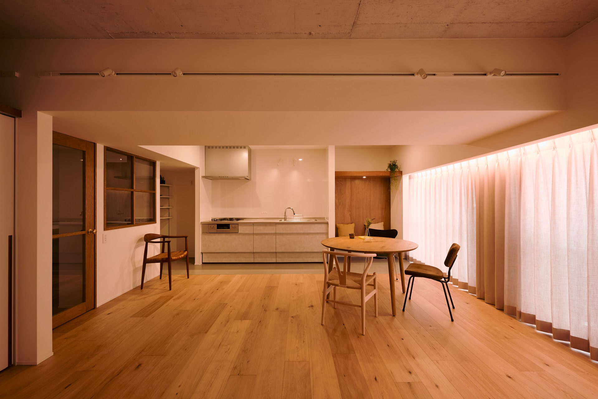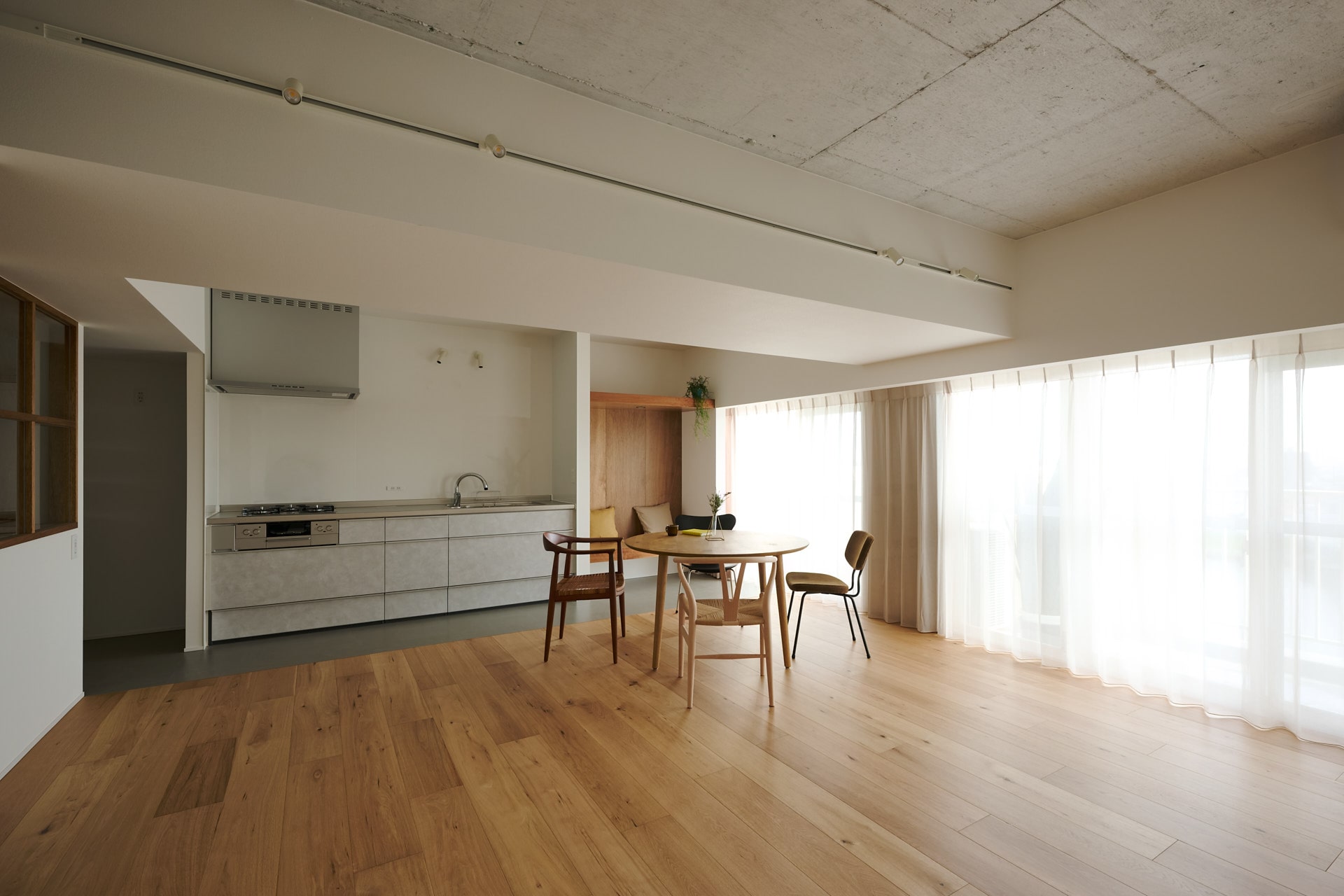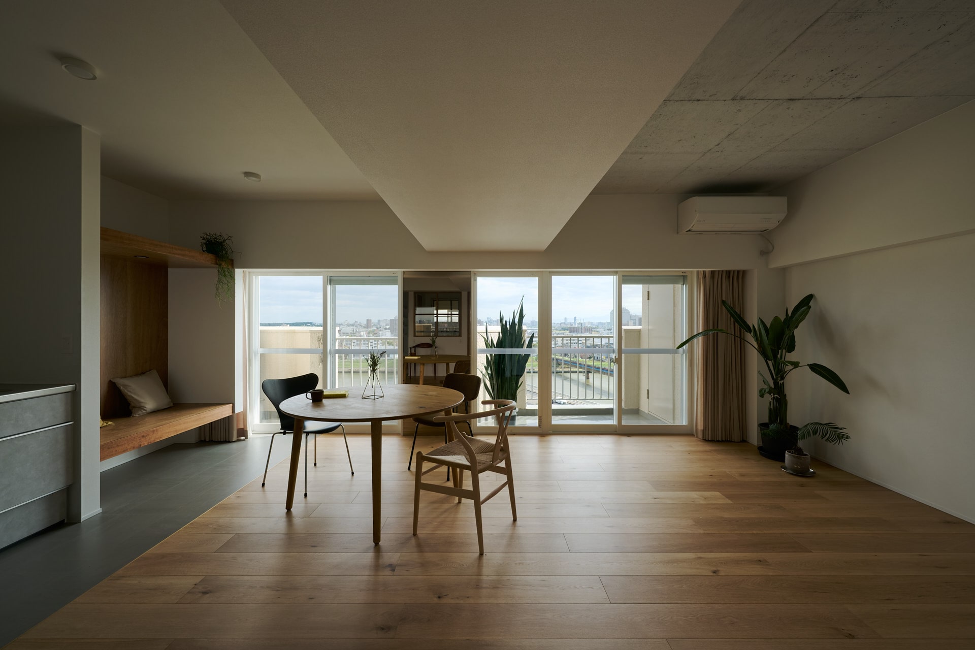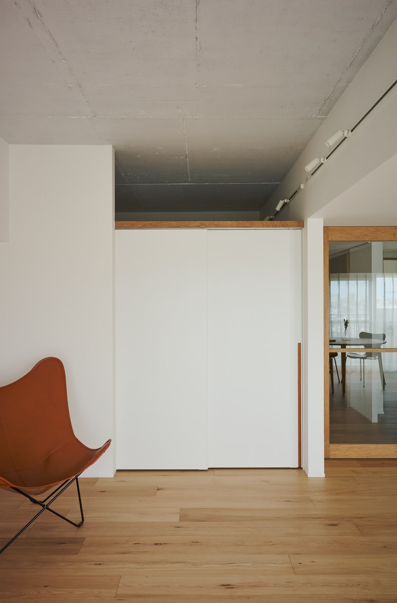 回遊性移動や多方向移動のため、浴室やトイレなどを除く全ての諸室を引戸で連続させているのでタイムパフォーマンスも非常に高い。スケルトンリノベーションの魅力は既存の間取りに制約を受けないという事に尽きるが、本計画においても個室は最小限とし、その他の余白をシューズクローゼットやウォークインクローゼット、また食品庫など、現代の生活に必須の機能へと置換え、自由設計のメリットを最大化させている。