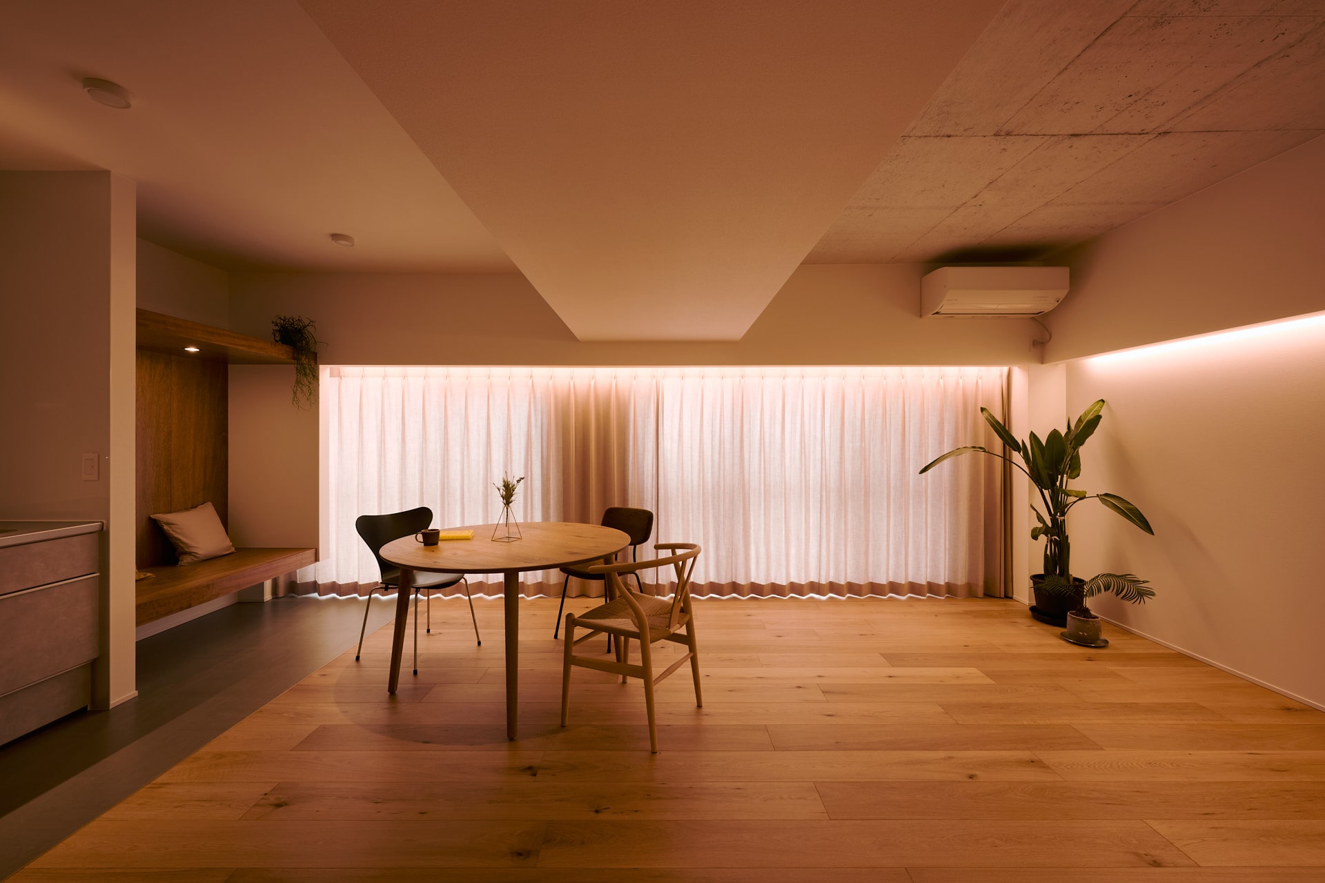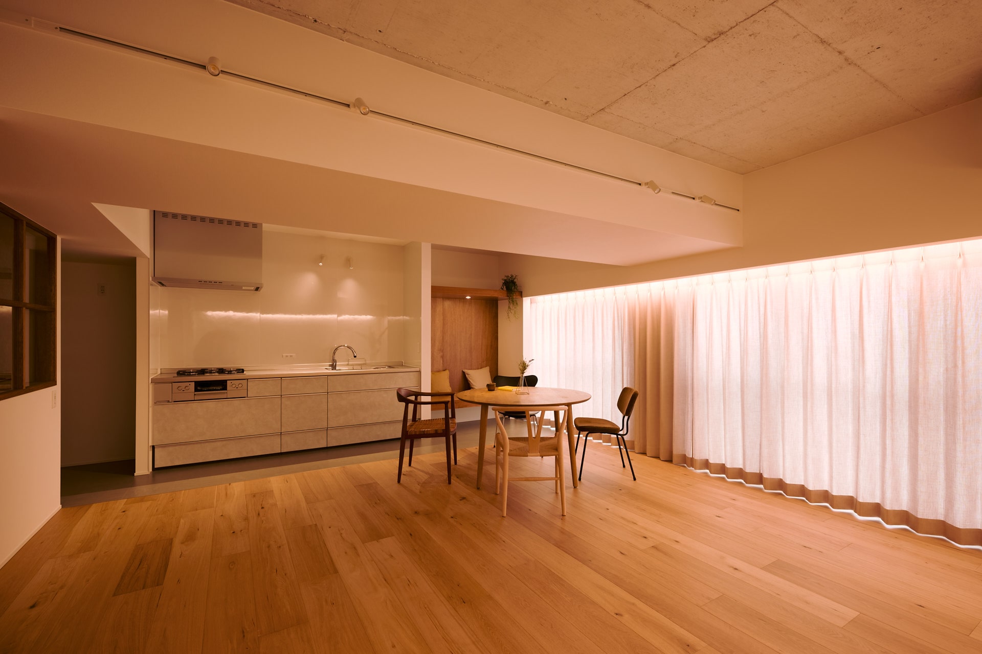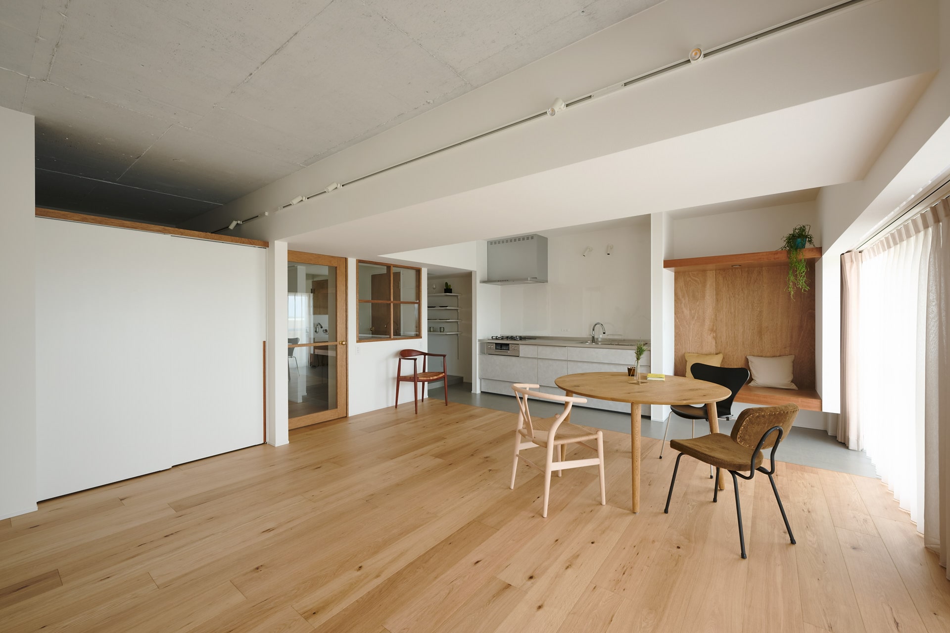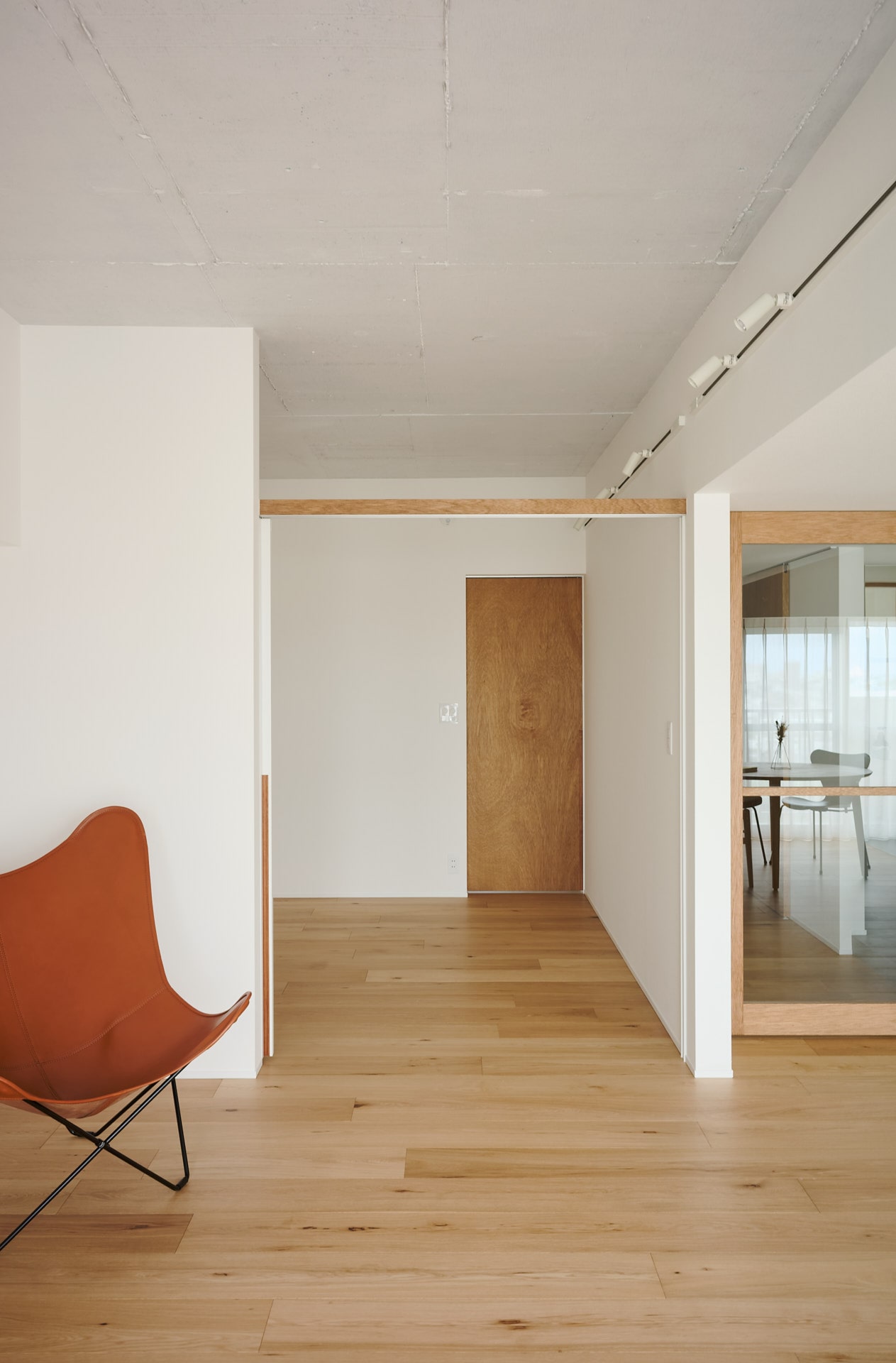 回遊性移動や多方向移動のため、浴室やトイレなどを除く全ての諸室を引戸で連続させているのでタイムパフォーマンスも非常に高い。スケルトンリノベーションの魅力は既存の間取りに制約を受けないという事に尽きるが、本計画においても個室は最小限とし、その他の余白をシューズクローゼットやウォークインクローゼット、また食品庫など、現代の生活に必須の機能へと置換え、自由設計のメリットを最大化させている。