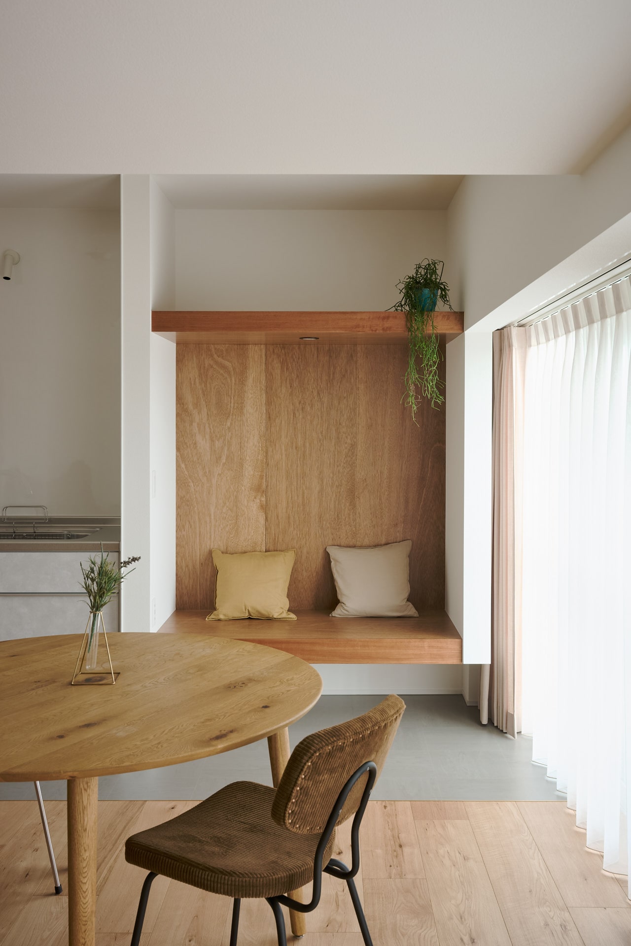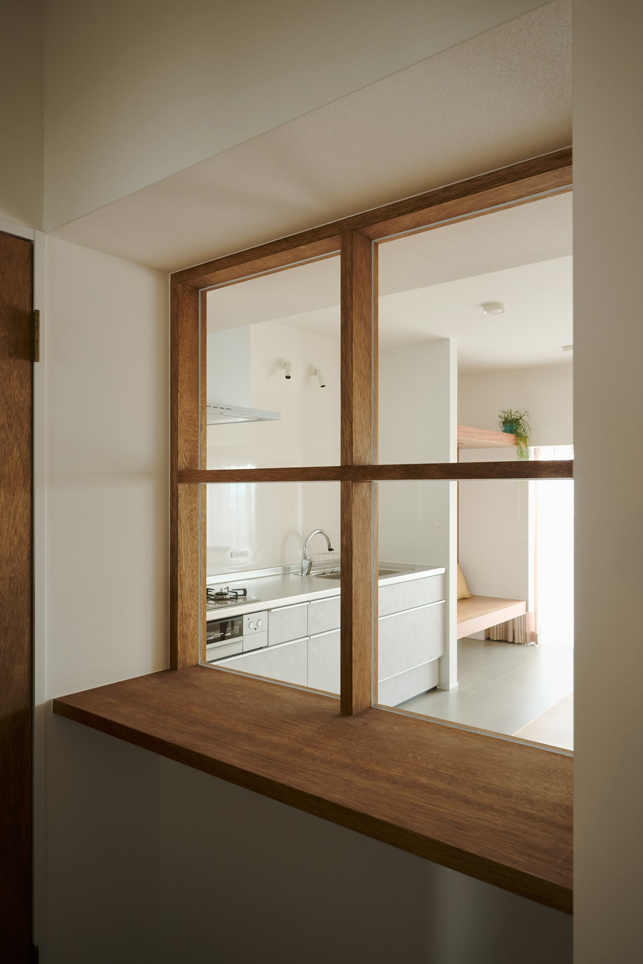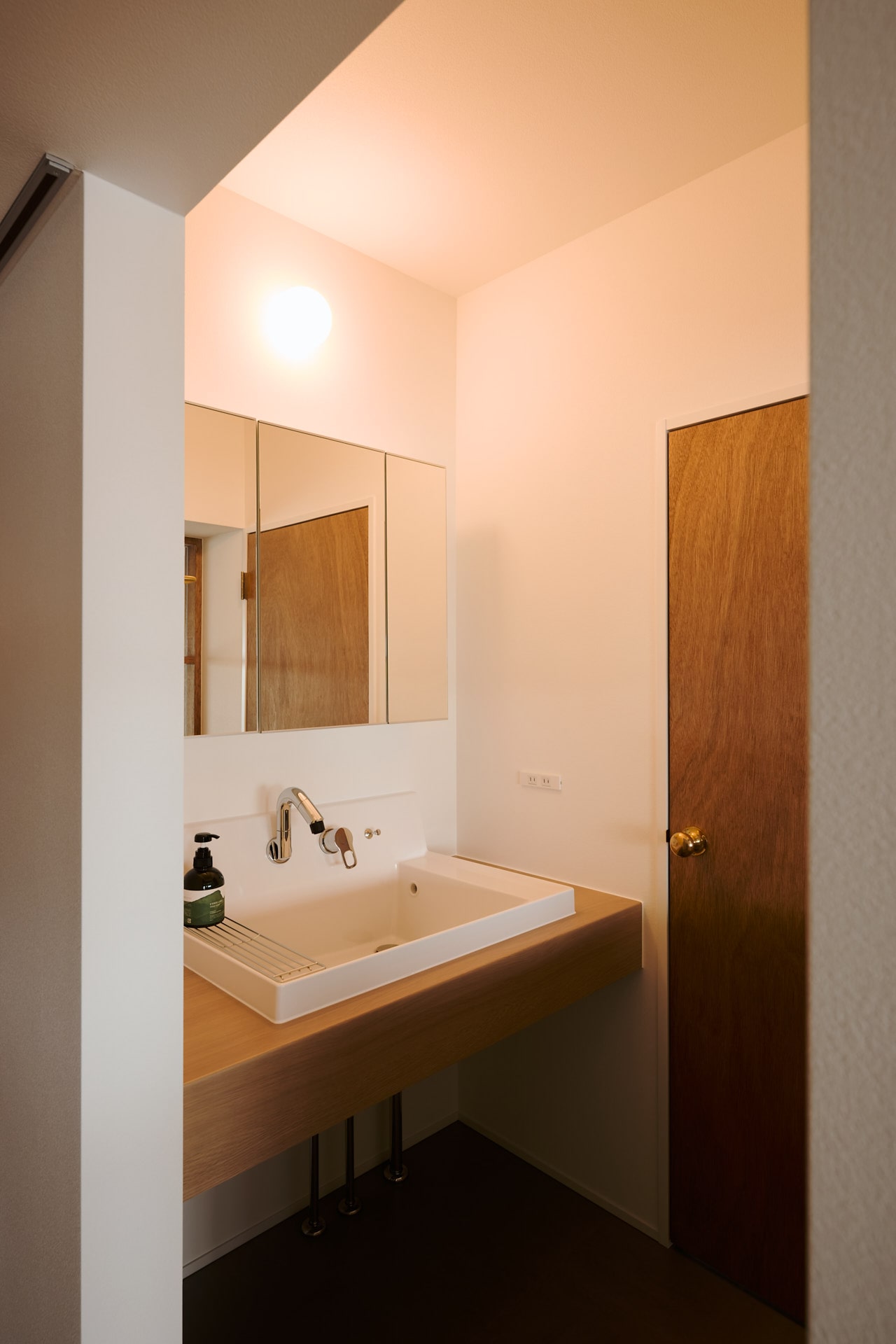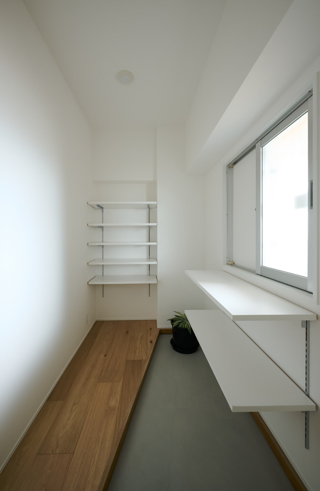 回遊性移動や多方向移動のため、浴室やトイレなどを除く全ての諸室を引戸で連続させているのでタイムパフォーマンスも非常に高い。スケルトンリノベーションの魅力は既存の間取りに制約を受けないという事に尽きるが、本計画においても個室は最小限とし、その他の余白をシューズクローゼットやウォークインクローゼット、また食品庫など、現代の生活に必須の機能へと置換え、自由設計のメリットを最大化させている。